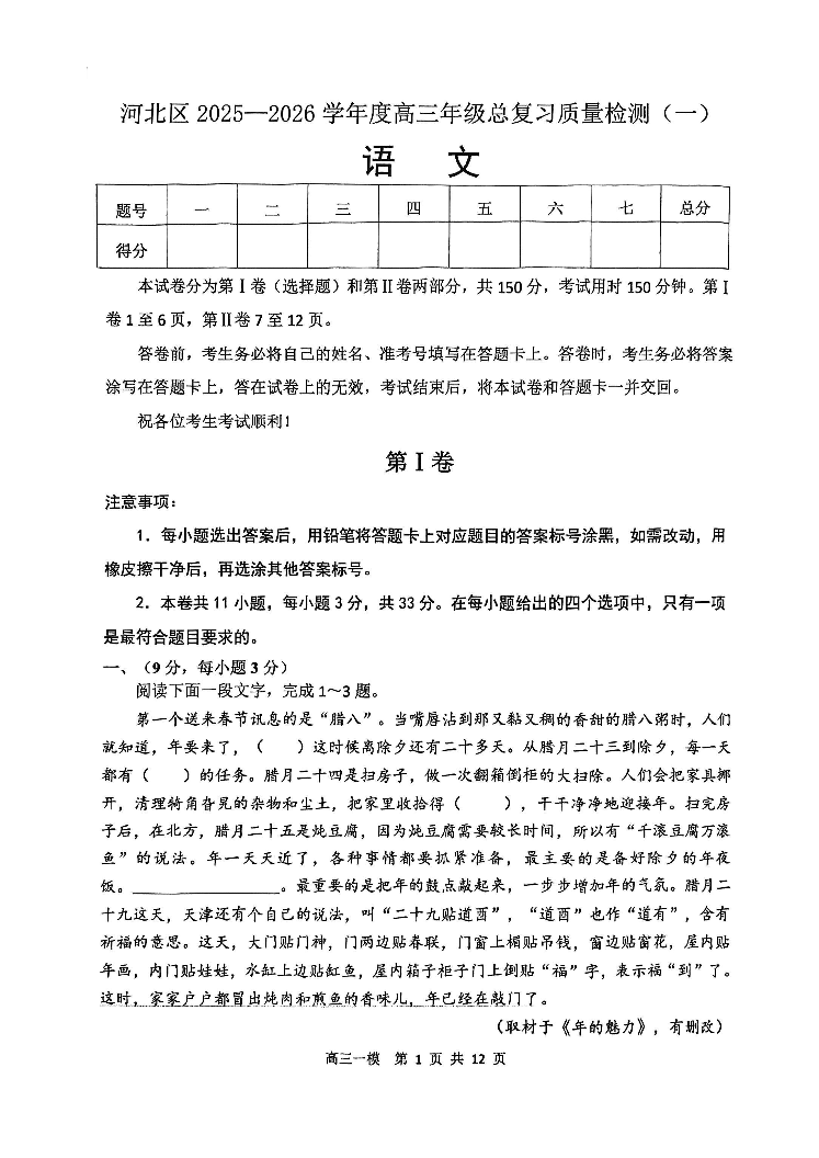 天津河北区2025-2026学年度高三年级总复习质量检测(一)语文.pdf