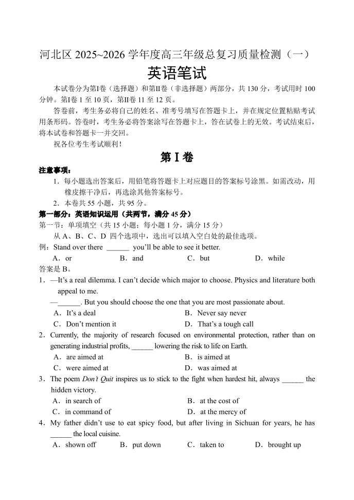 天津河北区2025-2026学年度高三年级总复习质量检测(一)英语.pdf