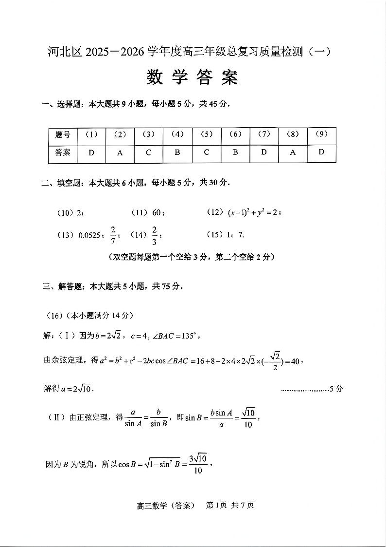 天津河北区2025-2026学年度高三年级总复习质量检测(一)数学答案.pdf