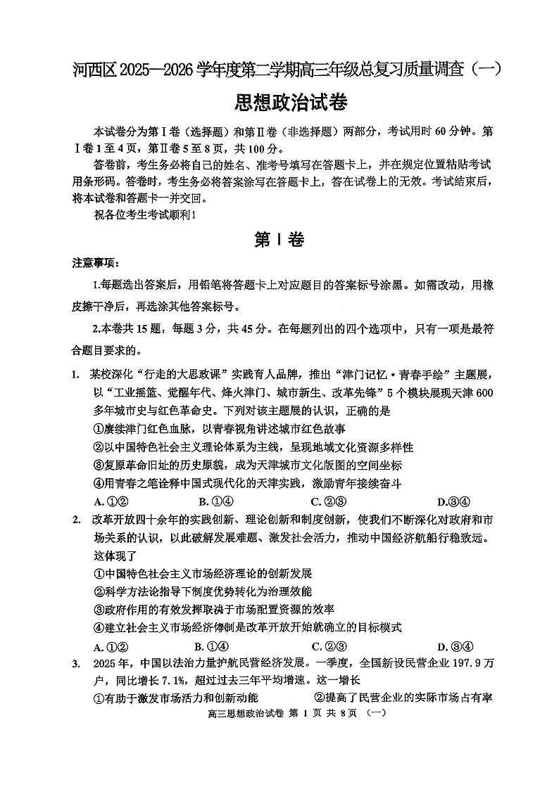 天津河西区2025-2026学年度第二学期高三年级总复习质量调查(一)政治.pdf