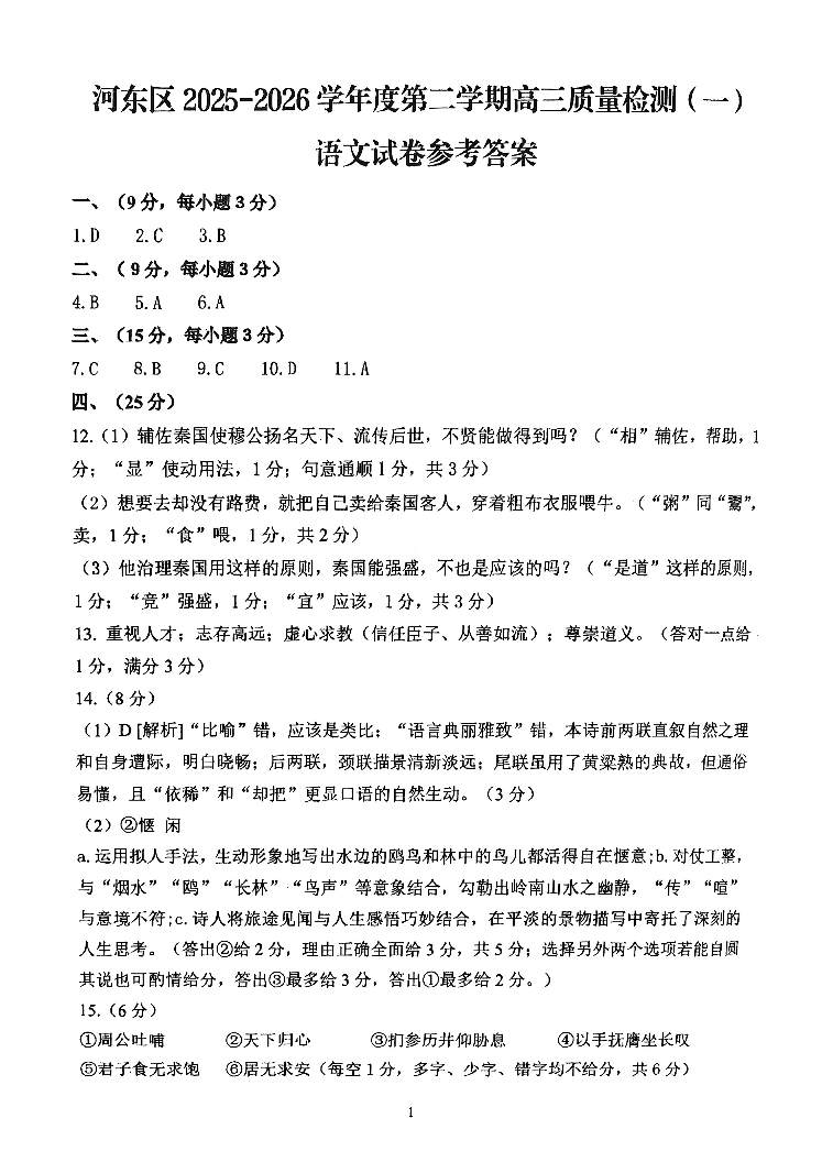 天津市河东区2025-2026学年度第二学期高三年级质量检测(一)语文答案.pdf
