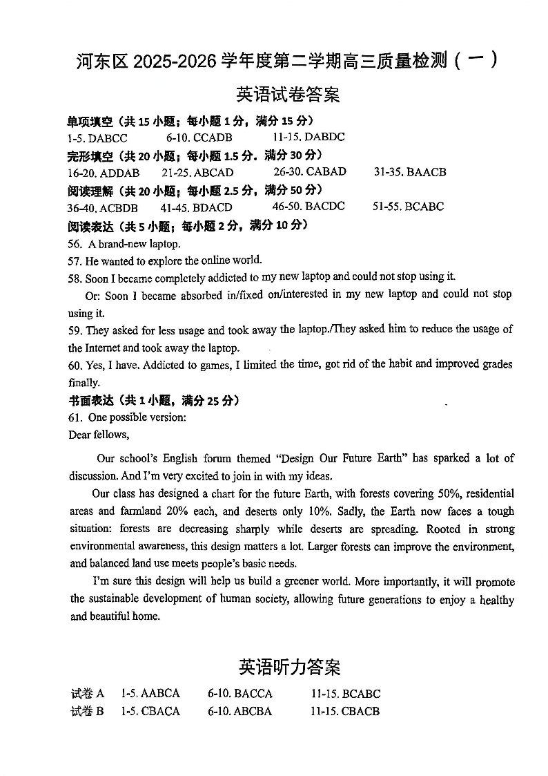 天津市河东区2025-2026学年度第二学期高三年级质量检测(一)英语答案.pdf