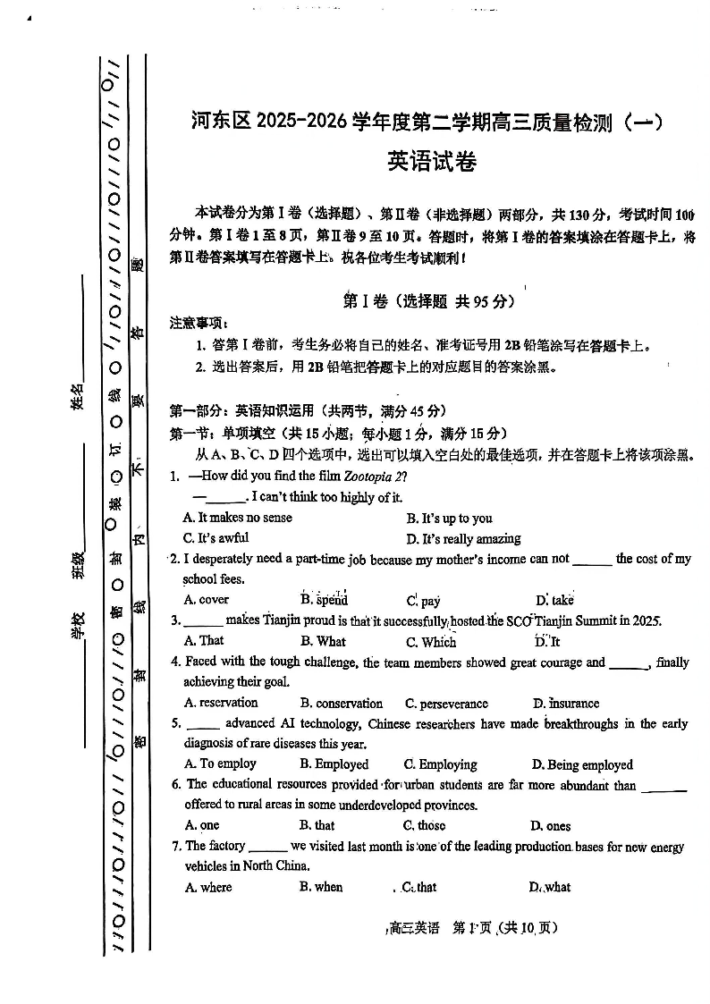天津市河东区2025-2026学年度第二学期高三年级质量检测(一)英语.pdf