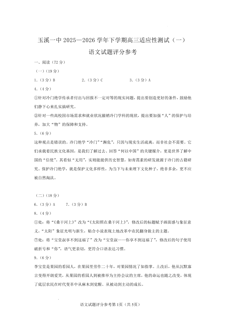 玉溪一中2025一2026学年下学期高三适应性测试(一)语文答案.pdf