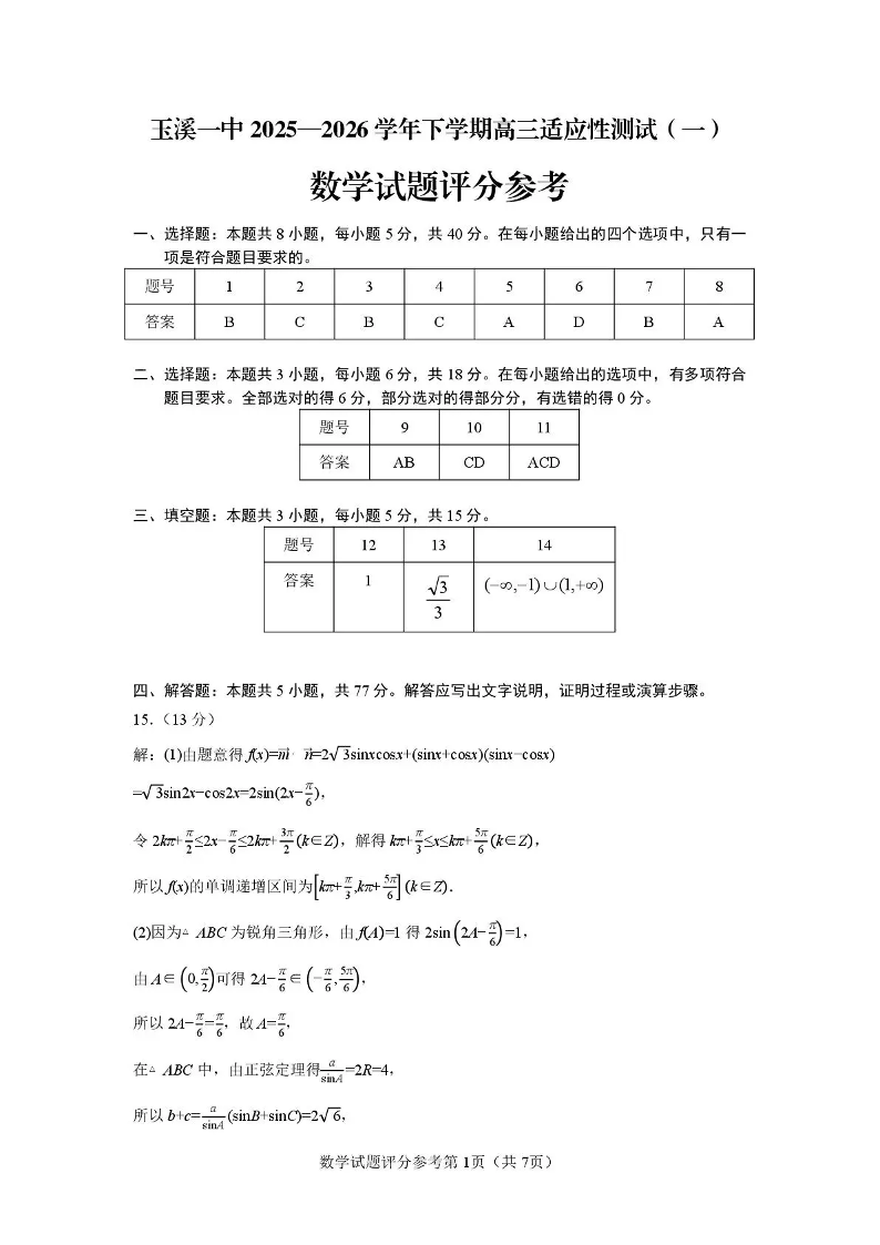 玉溪一中2025一2026学年下学期高三适应性测试(一)数学答案.pdf