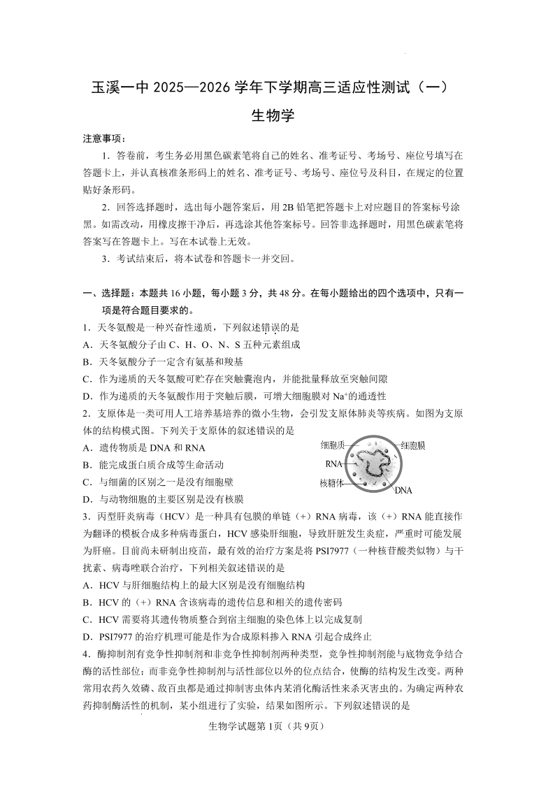 玉溪一中2025一2026学年下学期高三适应性测试(一)生物.pdf