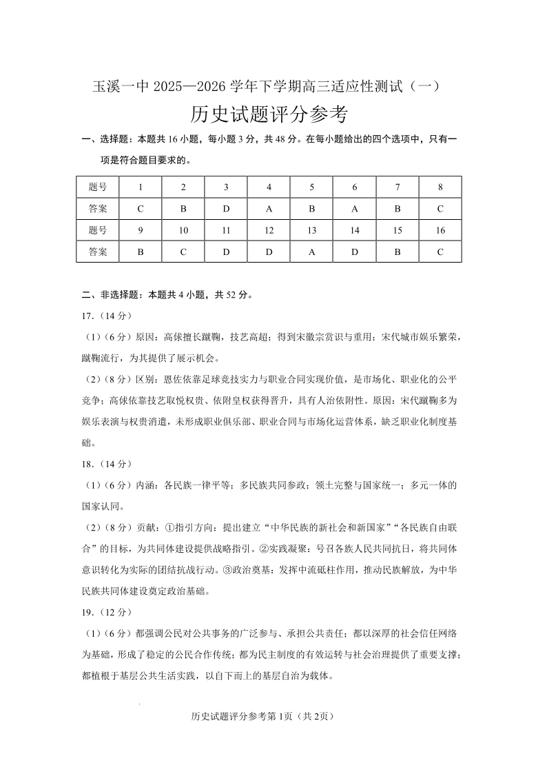 玉溪一中2025一2026学年下学期高三适应性测试(一)历史答案.pdf