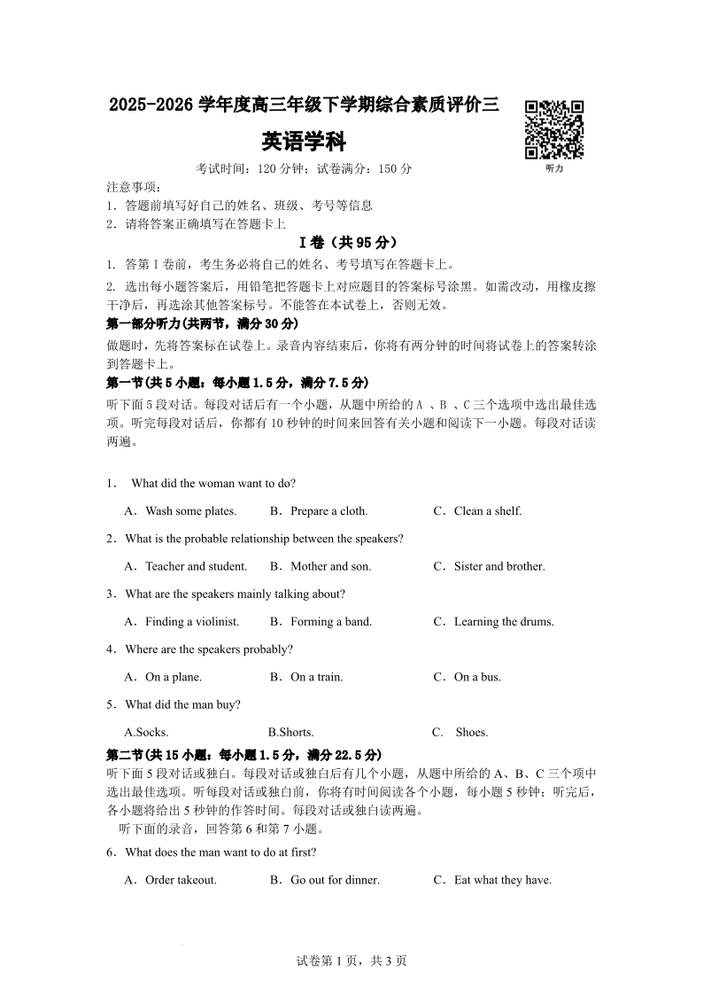 河北省衡水中学2025-2026学年高三年级下学期综合素质评价三 英语.pdf