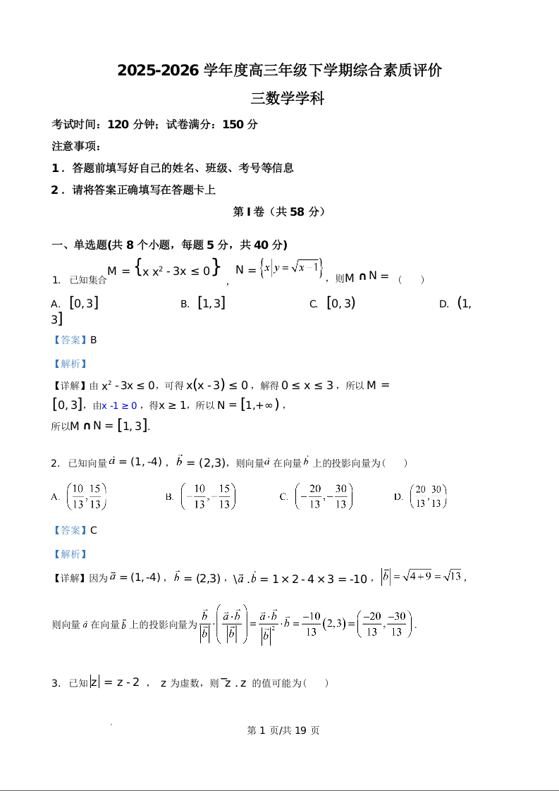 河北省衡水中学2025-2026学年高三年级下学期综合素质评价三 数学答案.docx
