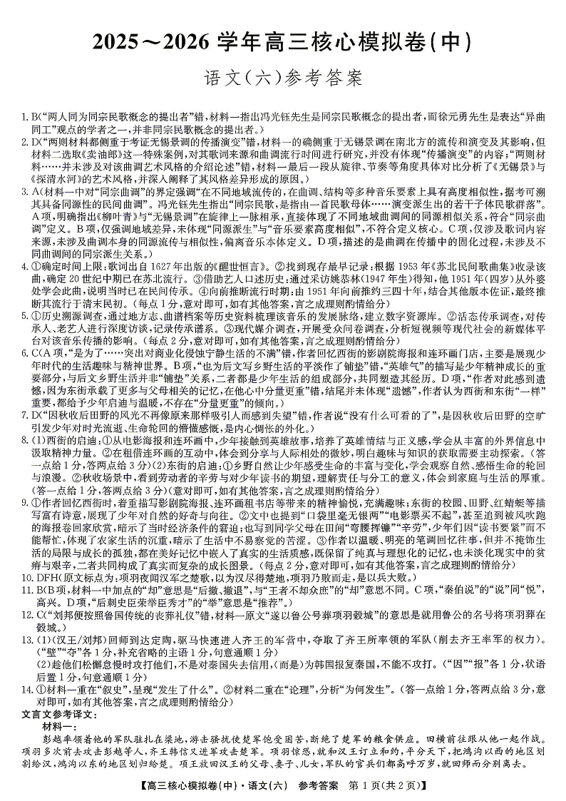 2025~2026学年高三核心模拟卷(六)语文答案.pdf