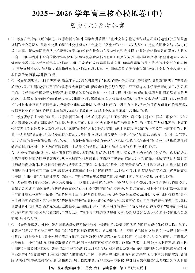 2025~2026学年高三核心模拟卷(六)历史答案.pdf