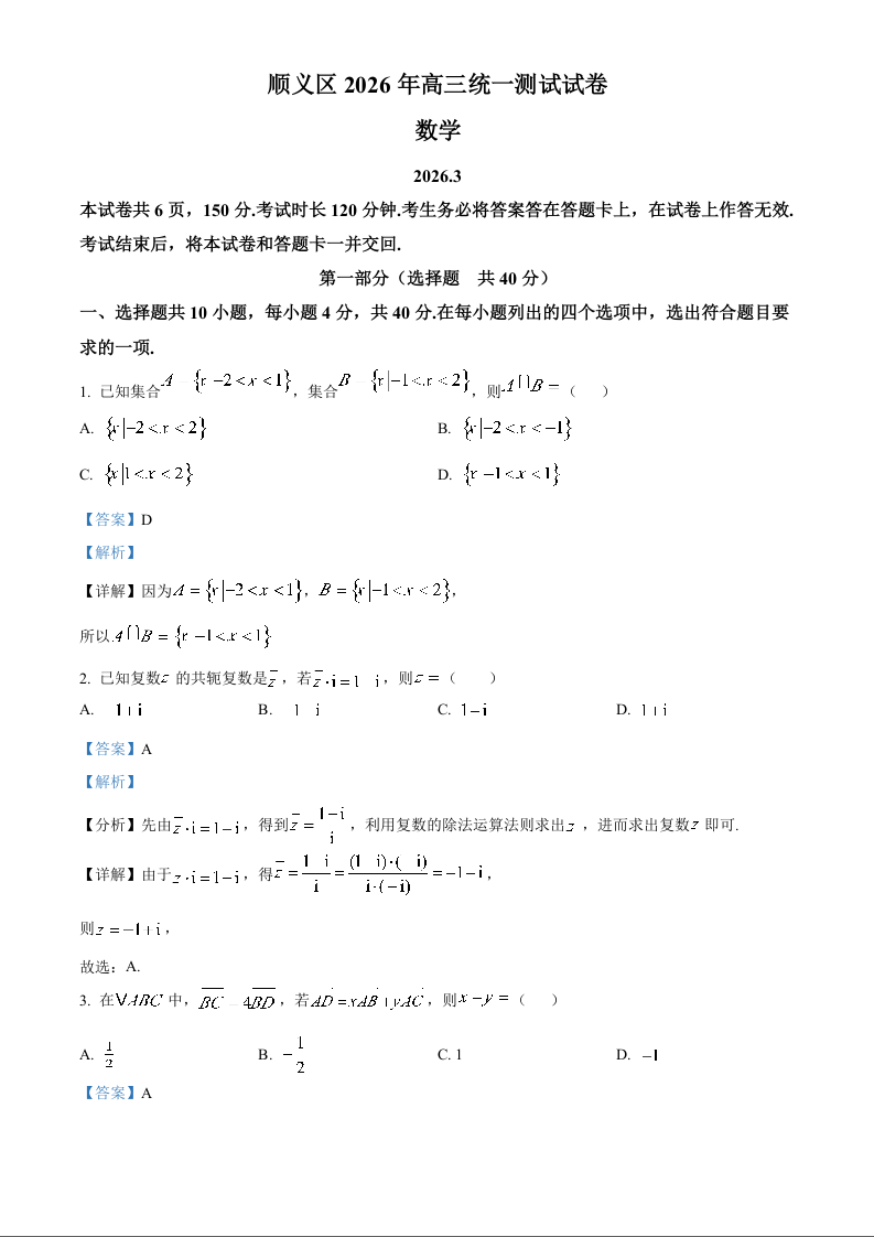 北京顺义区2026届高三下学期统一测试(一模)数学答案.docx