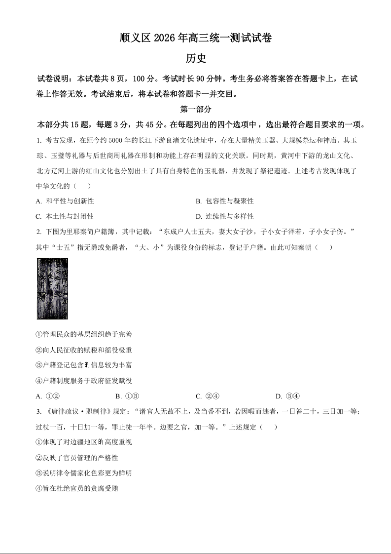 北京顺义区2026届高三下学期统一测试(一模)历史.docx