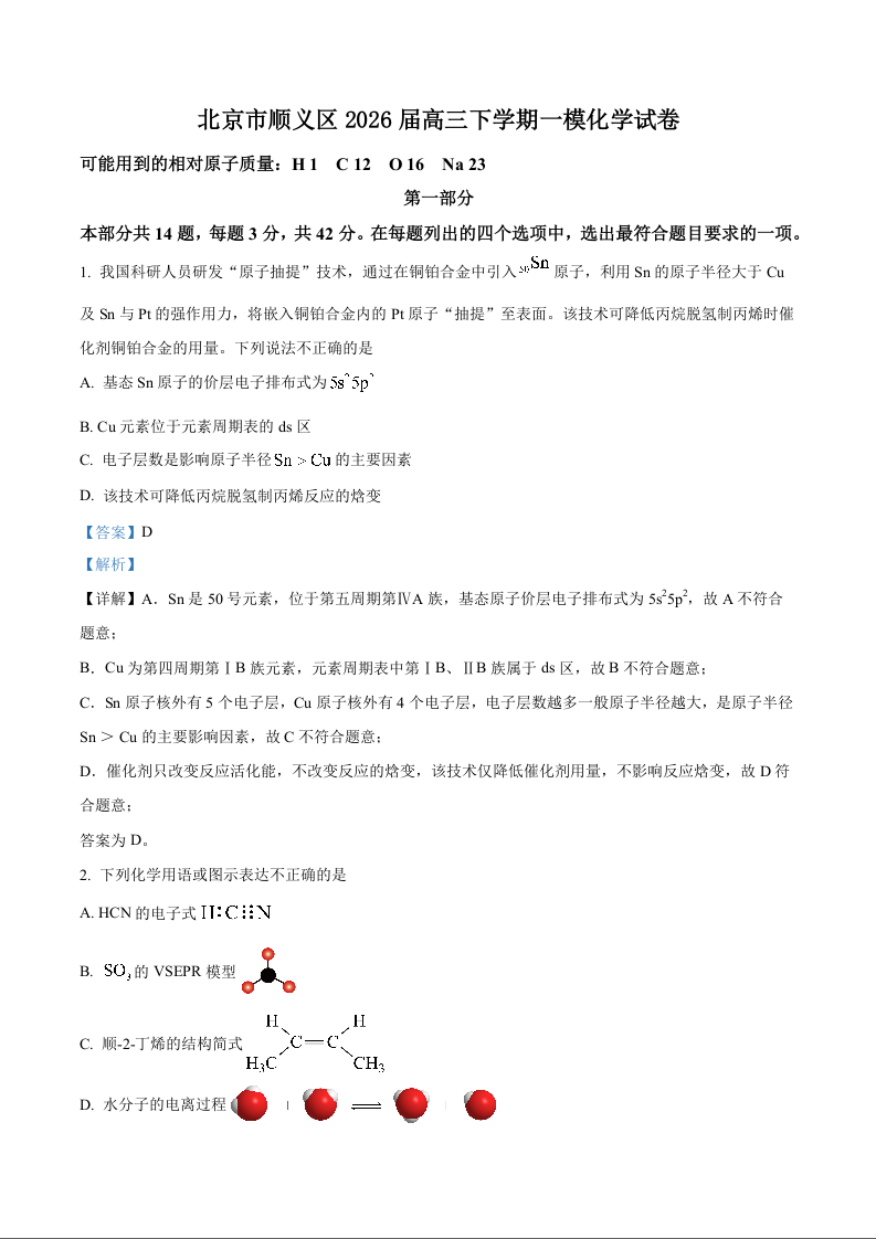 北京顺义区2026届高三下学期统一测试(一模)化学答案.docx