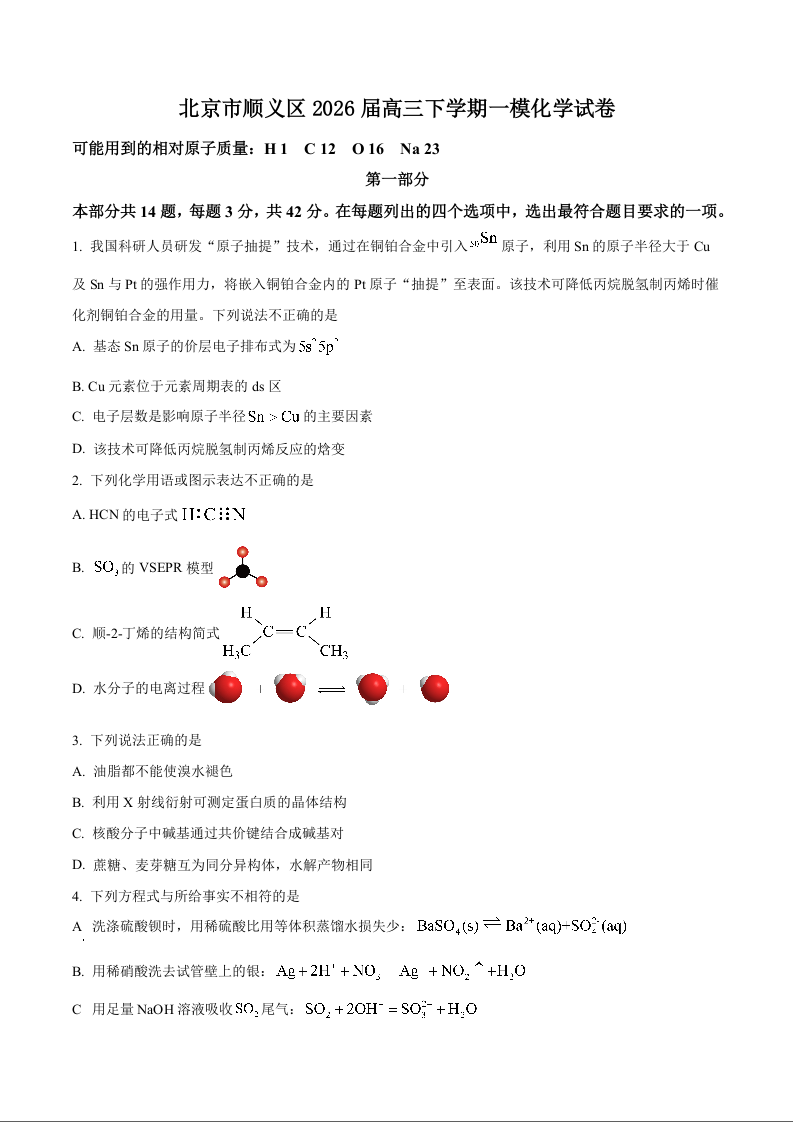 北京顺义区2026届高三下学期统一测试(一模)化学.docx