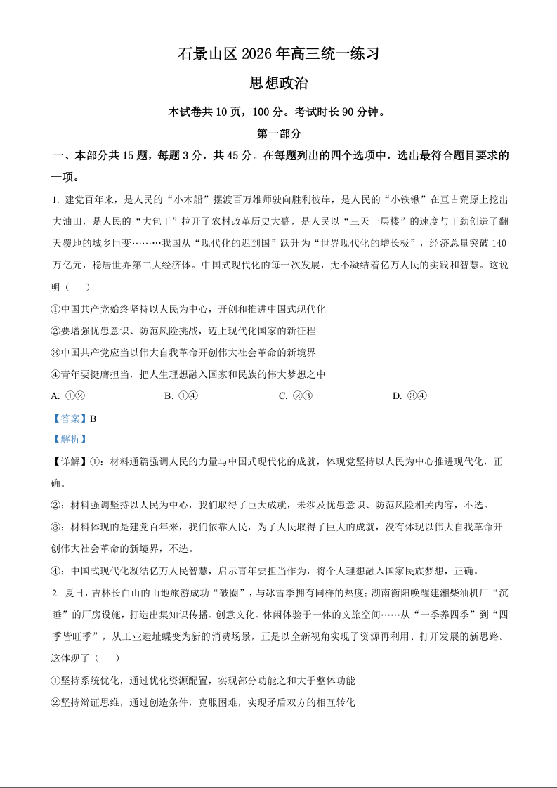 北京市石景山区2026年高三统一练习 政治答案.docx