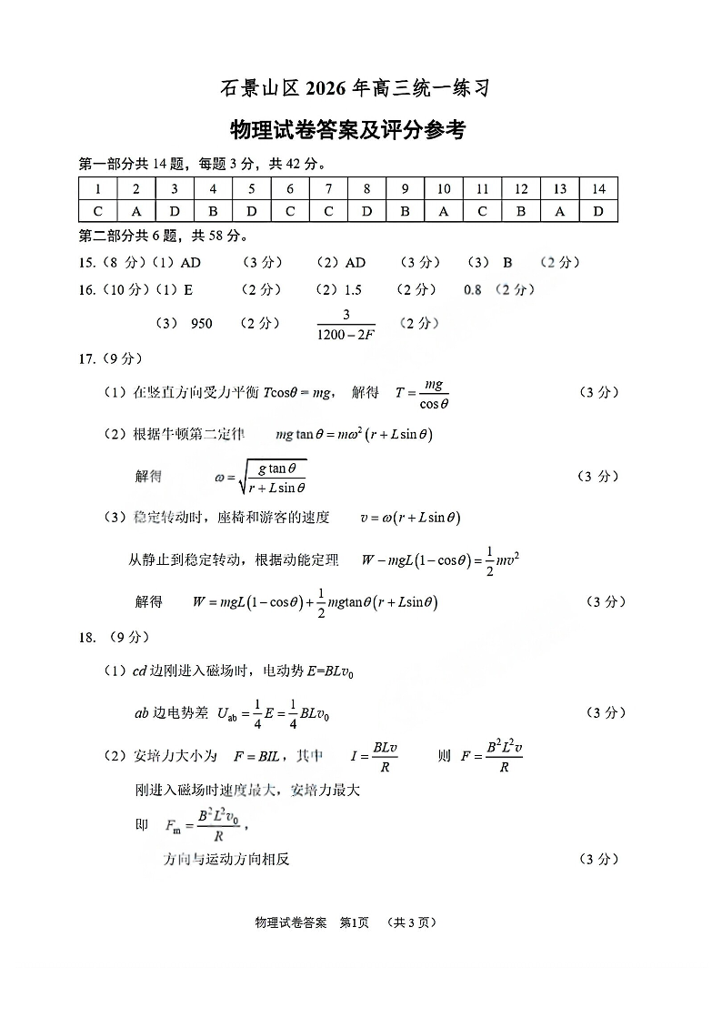 北京市石景山区2026年高三统一练习 物理答案.pdf