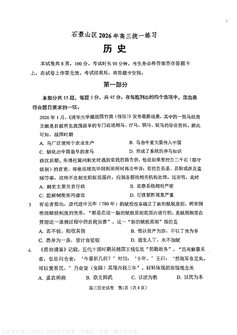 北京市石景山区2026年高三统一练习 历史.pdf