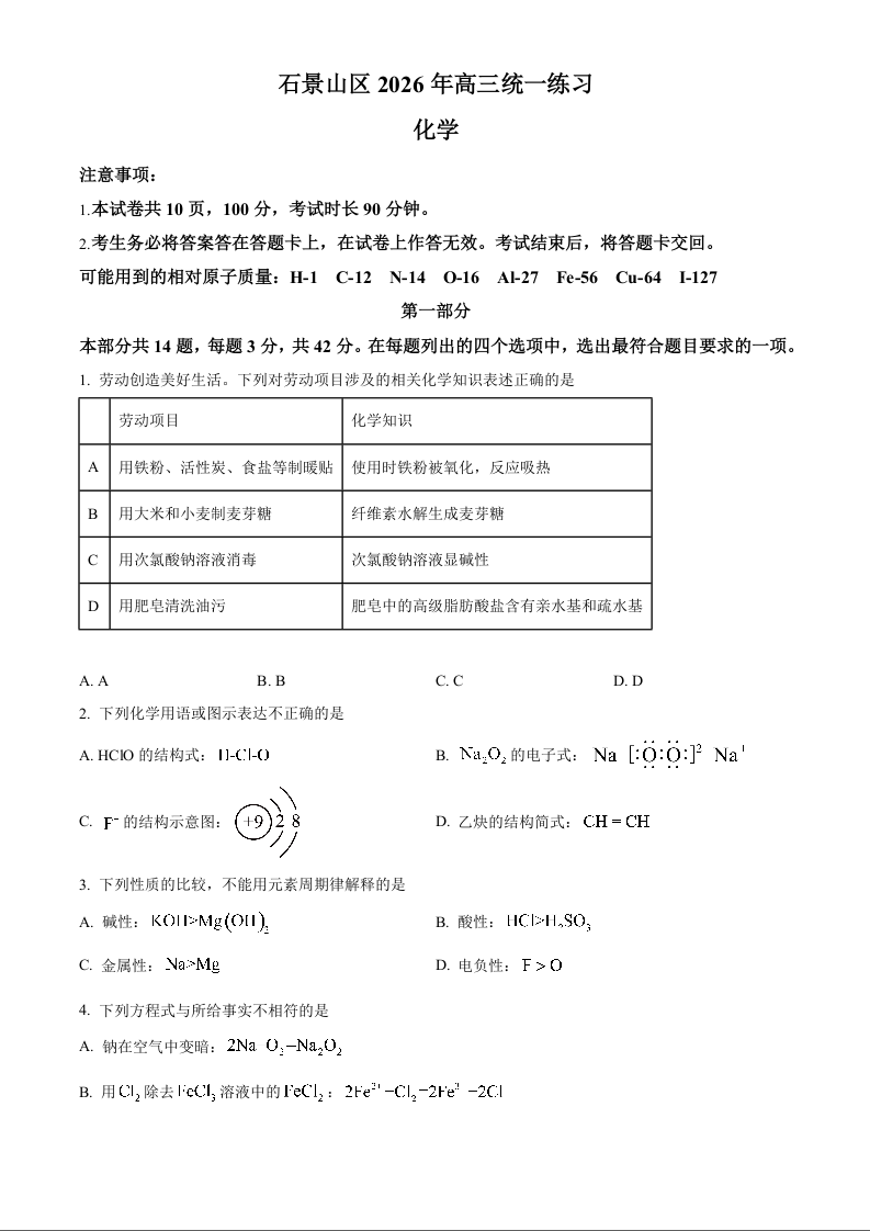 北京市石景山区2026年高三统一练习 化学.docx