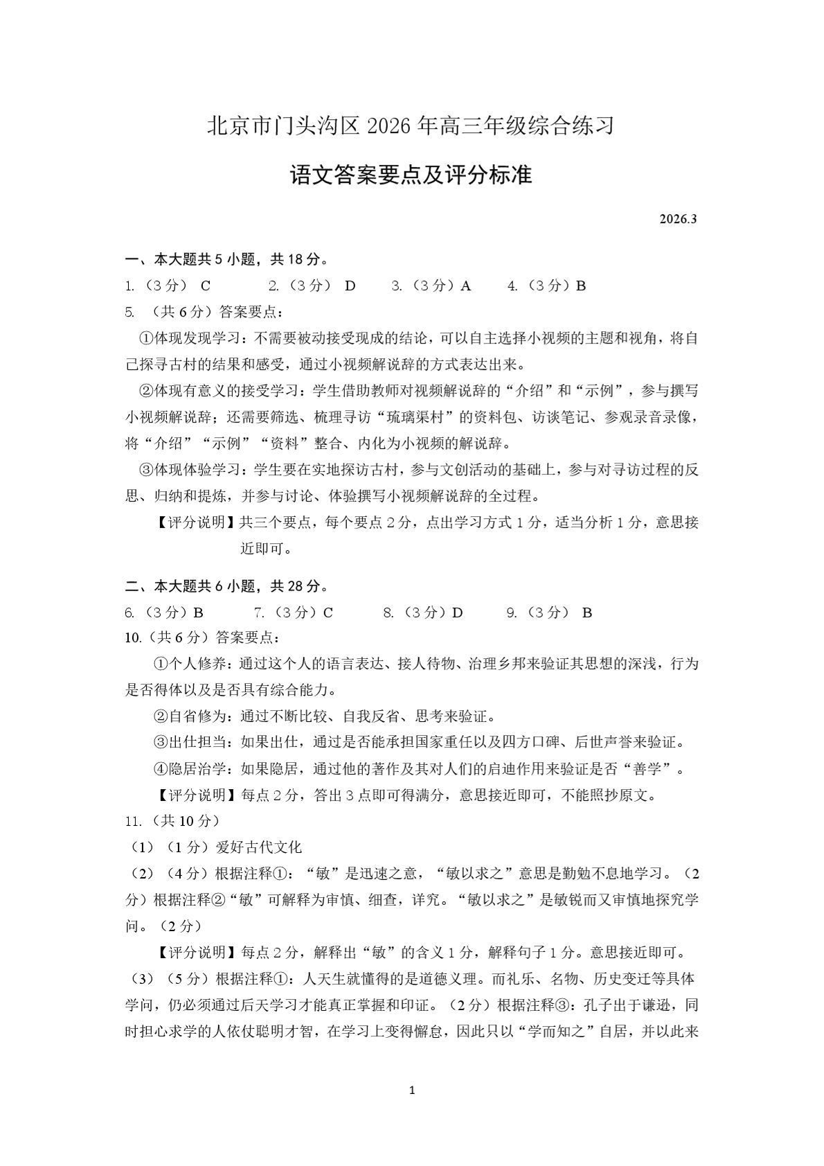 北京市门头沟区2026年高三下学期综合练习 语文答案.pdf
