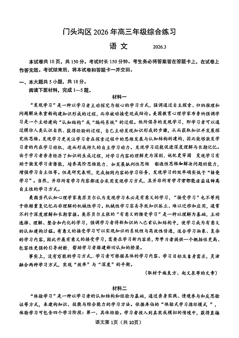 北京市门头沟区2026年高三下学期综合练习 语文.pdf