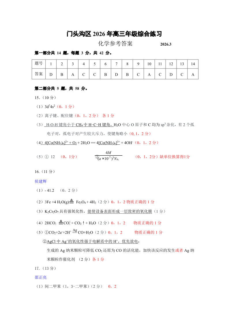北京市门头沟区2026年高三下学期综合练习 化学答案.pdf