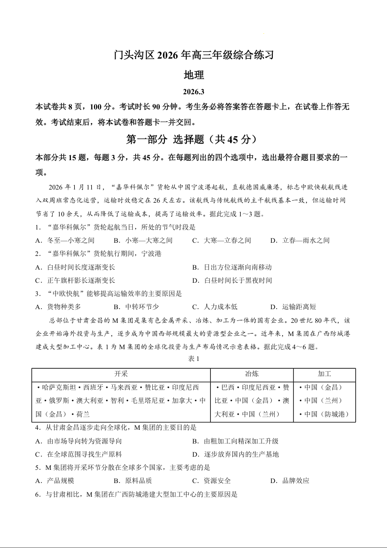 北京市门头沟区2026年高三下学期综合练习 地理.docx