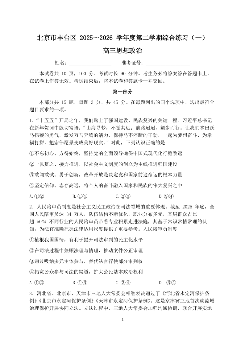北京市丰台区2025-2026学年度高三第二学期综合练习(一)政治.docx