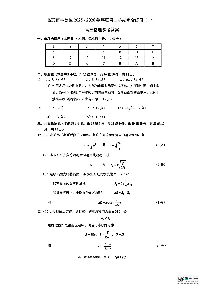 北京市丰台区2025-2026学年度高三第二学期综合练习(一)物理答案.pdf
