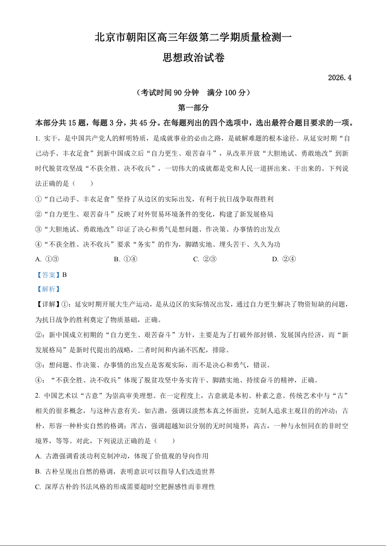 北京朝阳区2026届高三年级第二学期质量检测(一)政治答案.docx