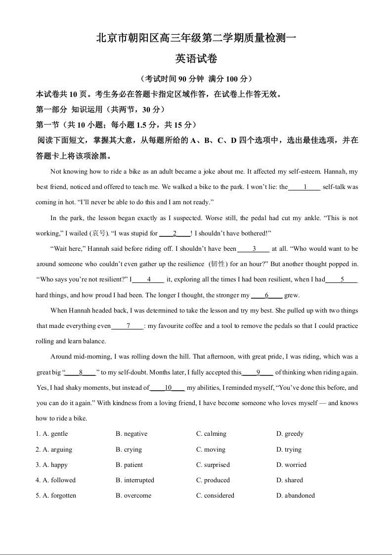 北京朝阳区2026届高三年级第二学期质量检测(一)英语.docx