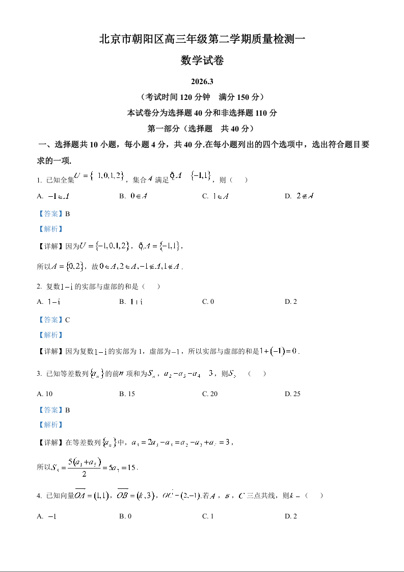 北京朝阳区2026届高三年级第二学期质量检测(一)数学答案.docx