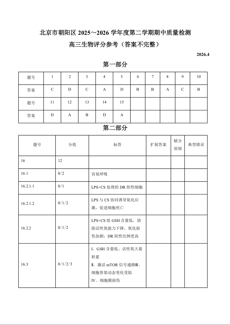北京朝阳区2026届高三年级第二学期质量检测(一)生物答案.docx