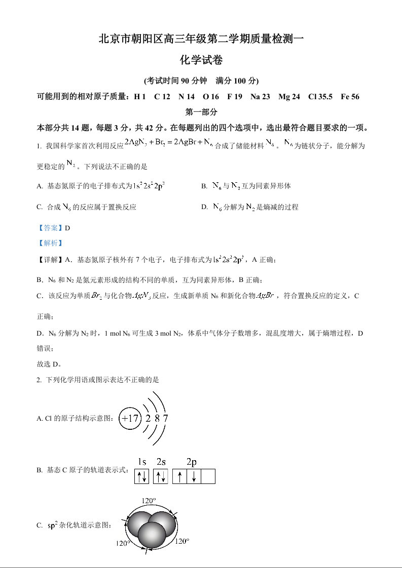 北京朝阳区2026届高三年级第二学期质量检测(一)化学答案.docx