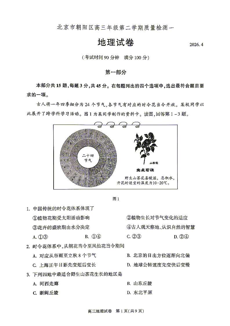 北京朝阳区2026届高三年级第二学期质量检测(一)地理.pdf