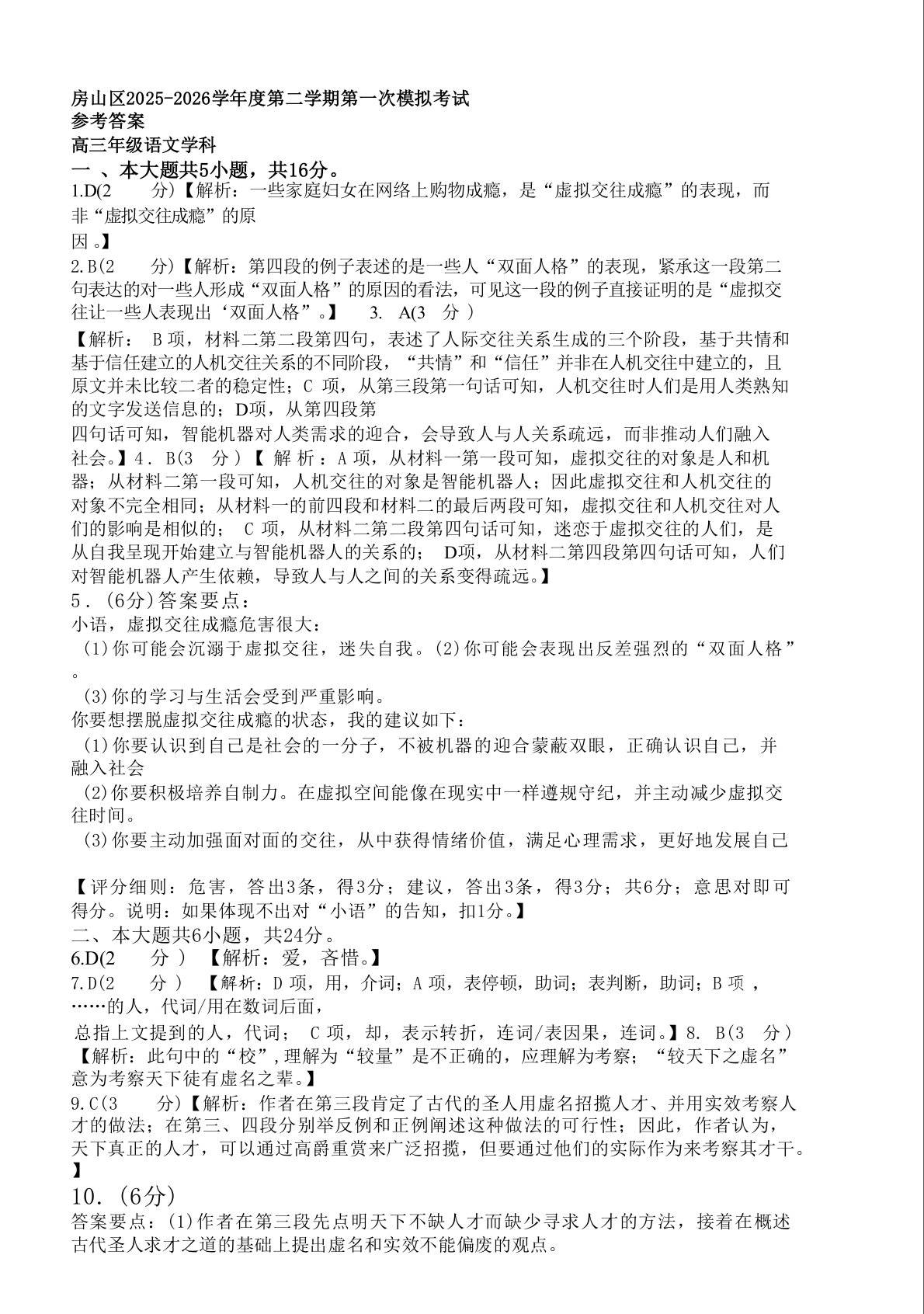 北京市房山区2026年高三年级第一次综合练习 语文答案.docx
