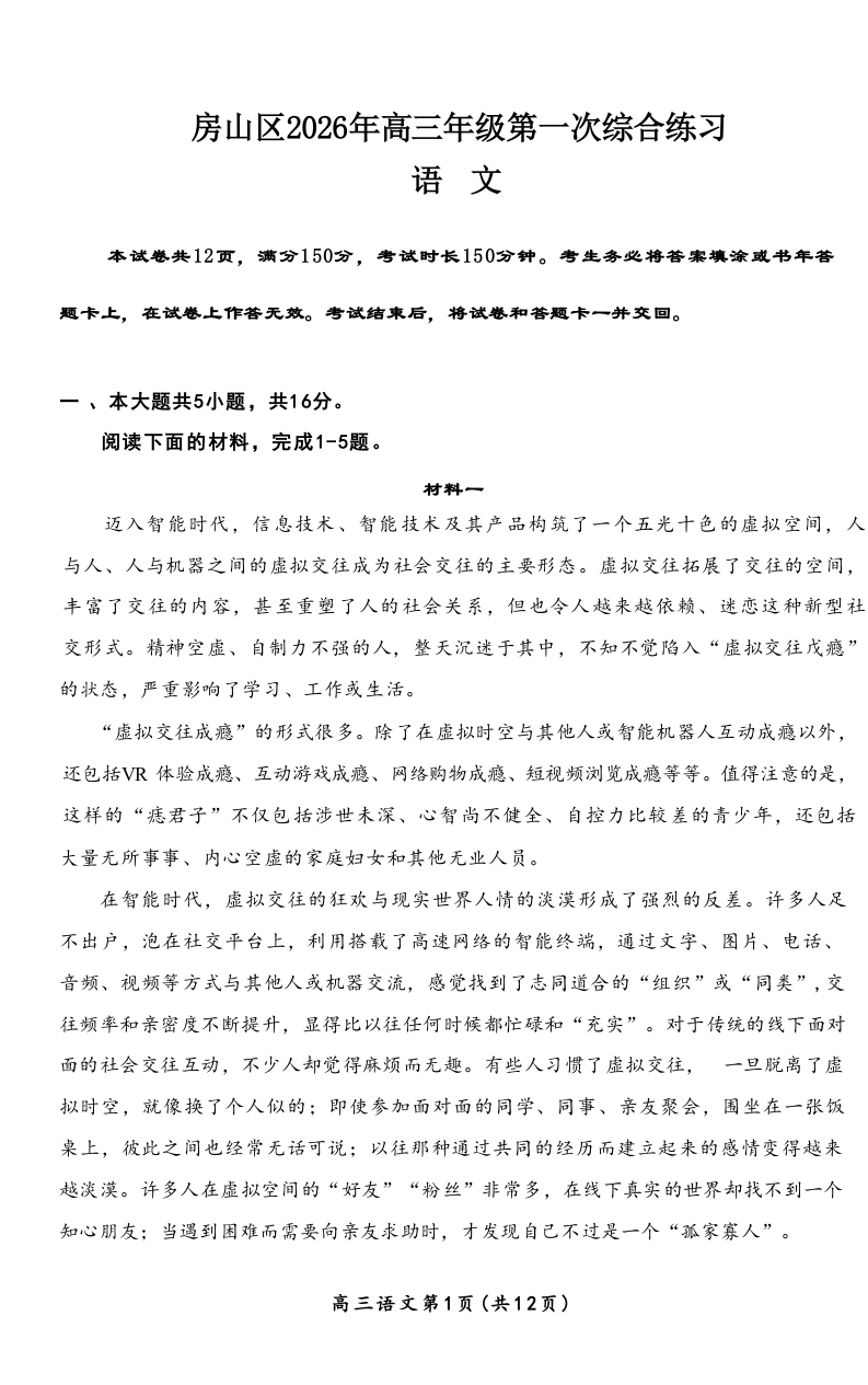 北京市房山区2026年高三年级第一次综合练习 语文.docx