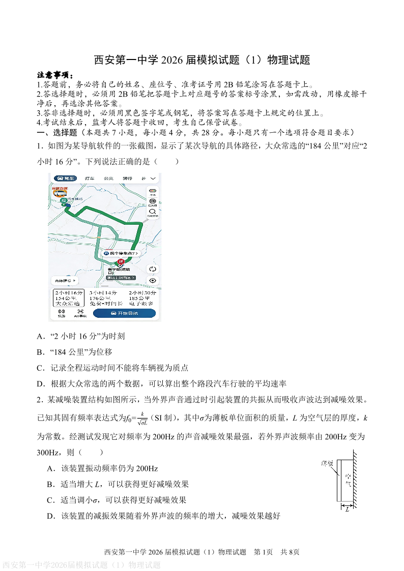 西安市第一中学2026届高三下学期模拟试题(一)物理.pdf