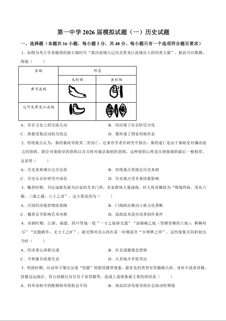 西安市第一中学2026届高三下学期模拟试题(一)历史.docx