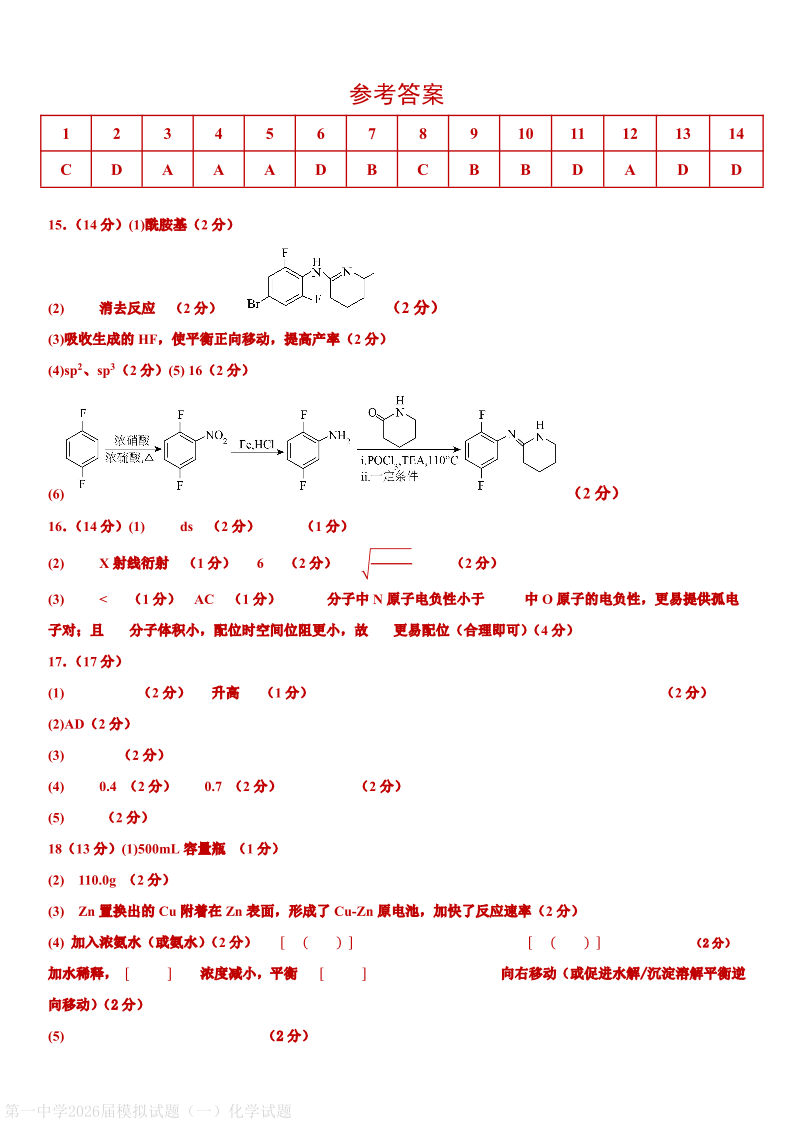 西安市第一中学2026届高三下学期模拟试题(一)化学答案.pdf
