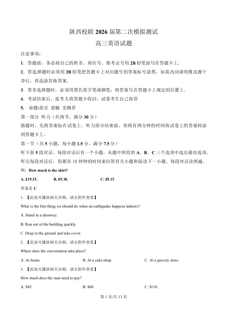 陕西省校联(西安市,渭南市,榆林市)2026届高三第二次模拟测试 英语.docx