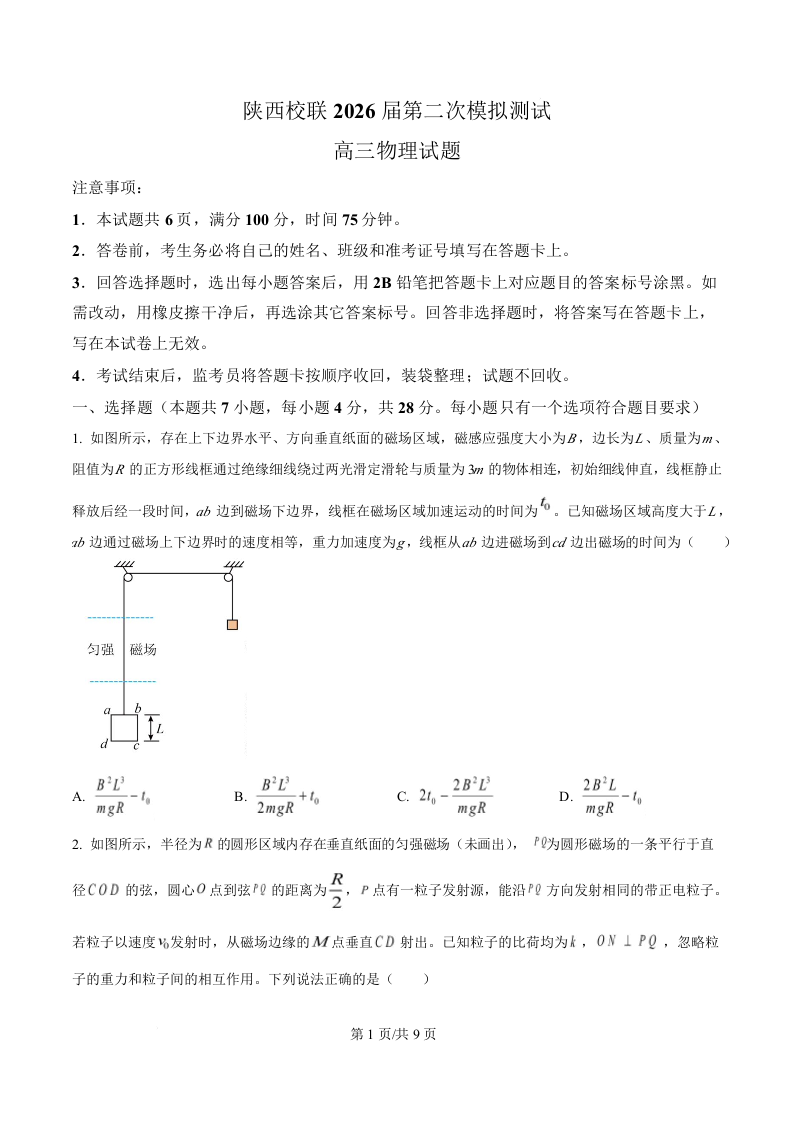 陕西省校联(西安市,渭南市,榆林市)2026届高三第二次模拟测试 物理.docx