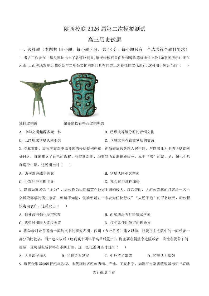陕西省校联(西安市,渭南市,榆林市)2026届高三第二次模拟测试 历史.docx