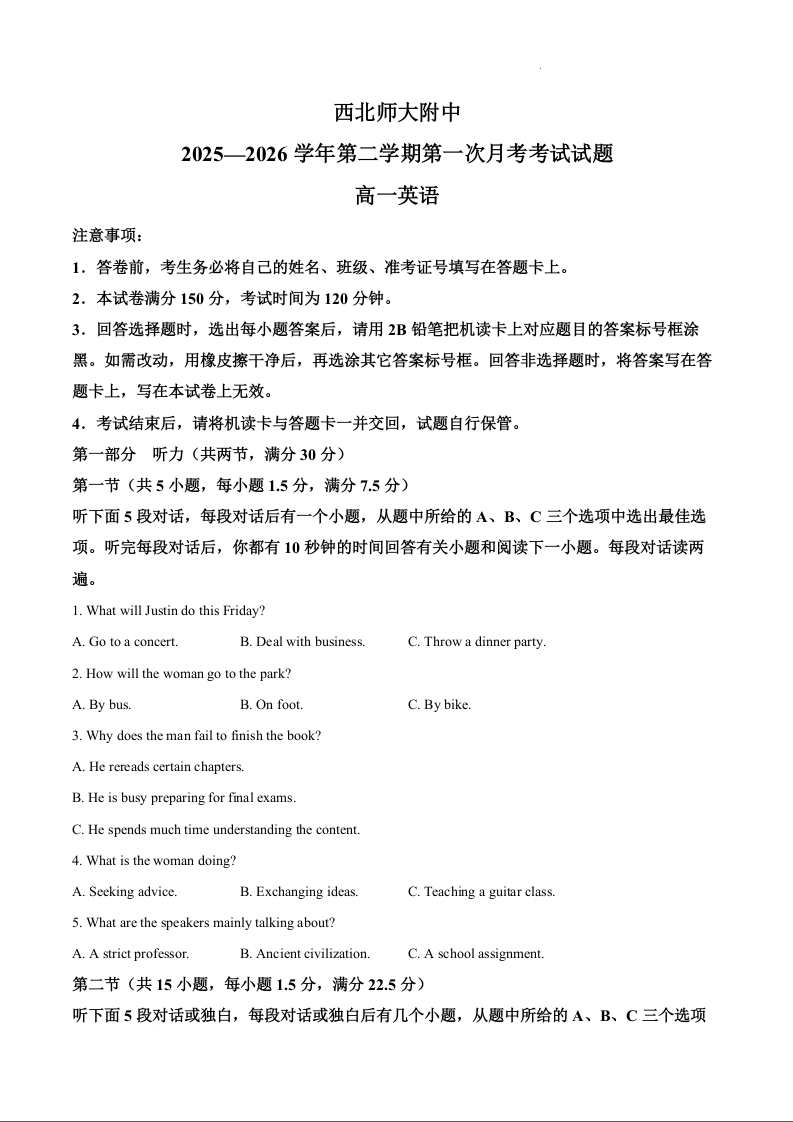 西北师范大学附属中学2025-2026学年高一下学期第一次月考 英语.docx