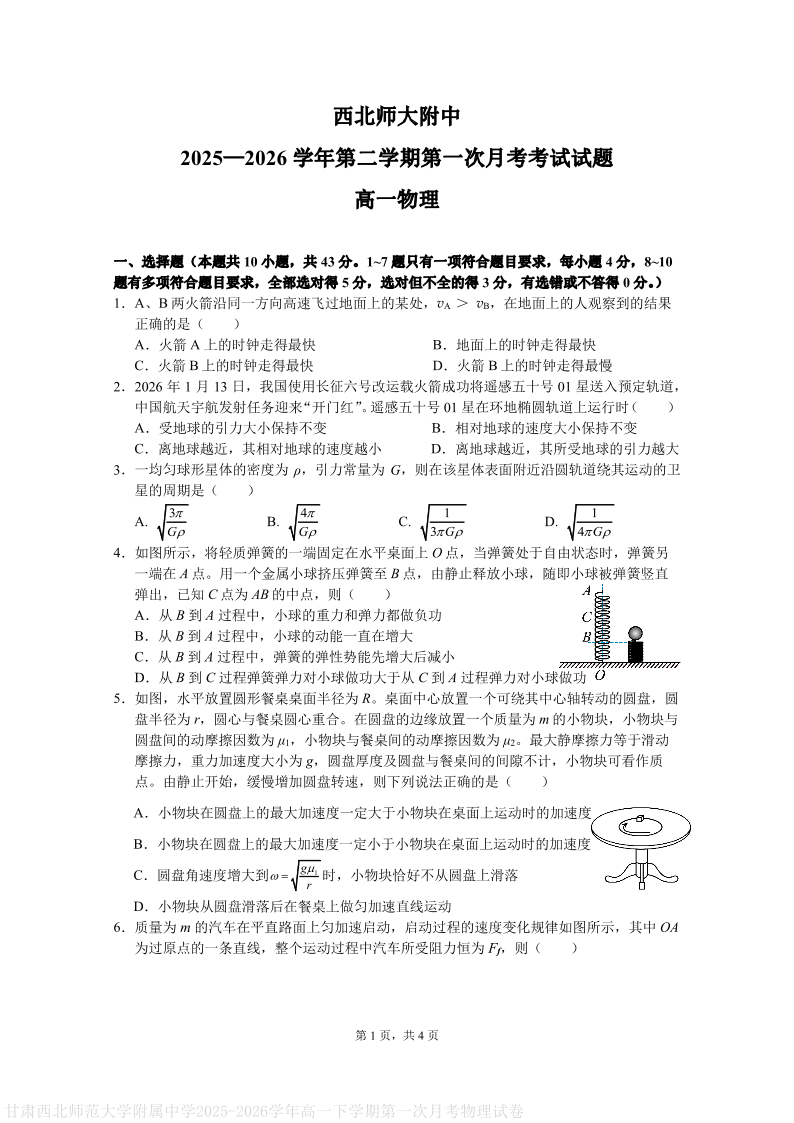 西北师范大学附属中学2025-2026学年高一下学期第一次月考 物理.pdf
