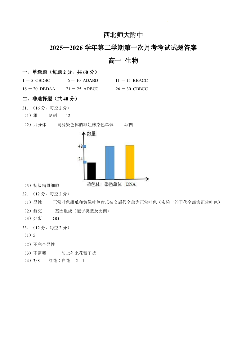 西北师范大学附属中学2025-2026学年高一下学期第一次月考 生物答案.docx