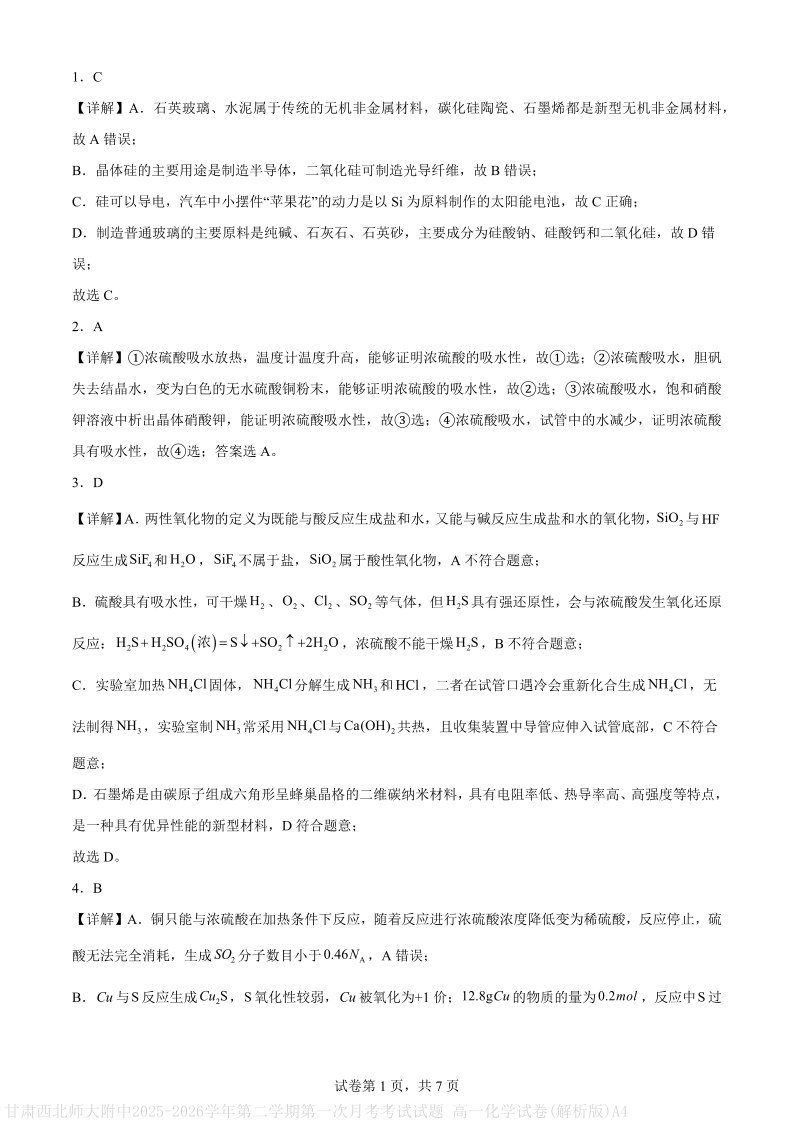 西北师范大学附属中学2025-2026学年高一下学期第一次月考 化学答案.pdf