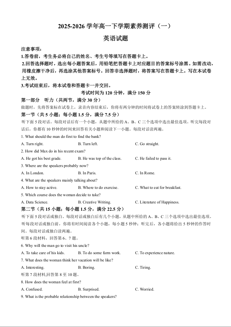 河南新乡市2025-2026学年高一下学期素养测评(一)英语试题(含答案).docx