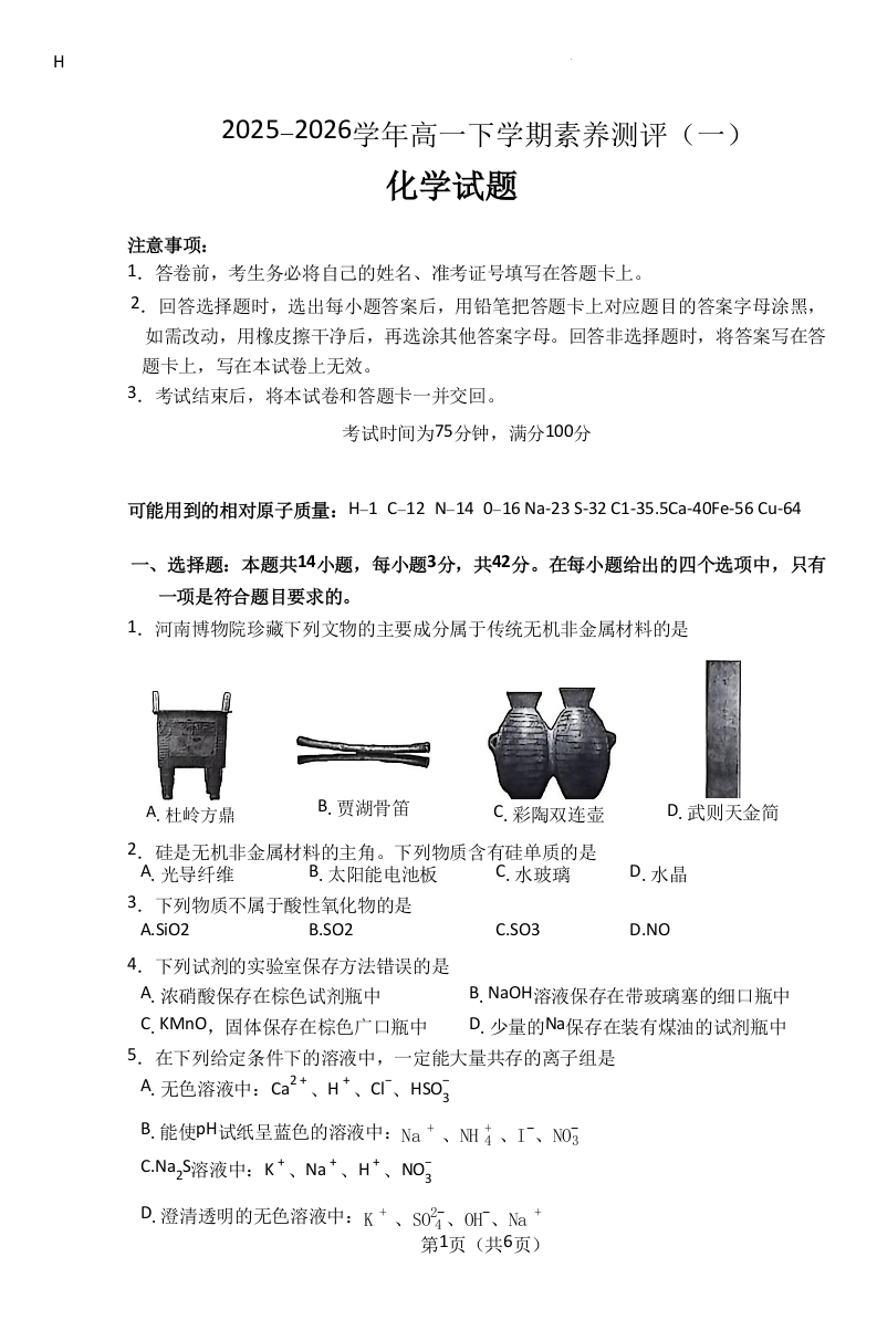 河南新乡市2025-2026学年高一下学期素养测评(一)化学.docx