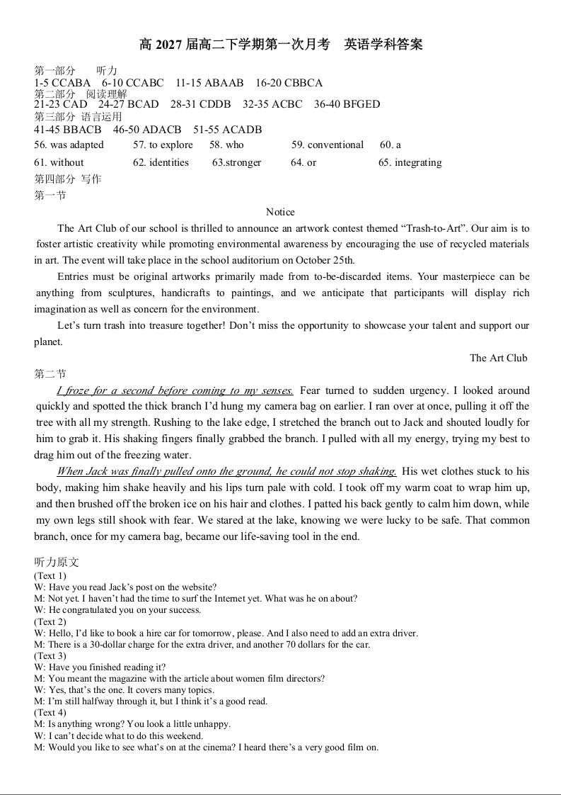 玉溪一中2025-2026学年下学期高二年级月考一 英语答案.docx